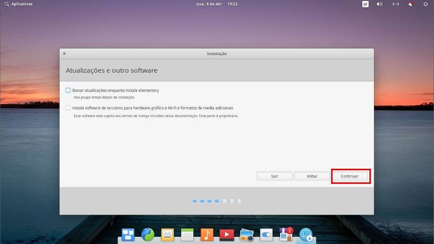 7. Caso já queira baixar as atualizações do sistema, deixe a primeira caixinha habilitada. Já para instalar alguns drivers que não vem por padrão na imagem do sistema e que podem ser úteis, marque a segunda caixinha. Aqui, é tudo opcional;