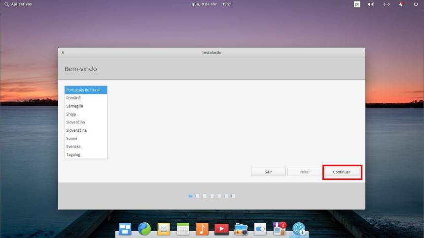 5. Na primeira tela, apenas certifique-se de que o “Português do Brasil” ainda está selecionado e clique em “Continuar”;