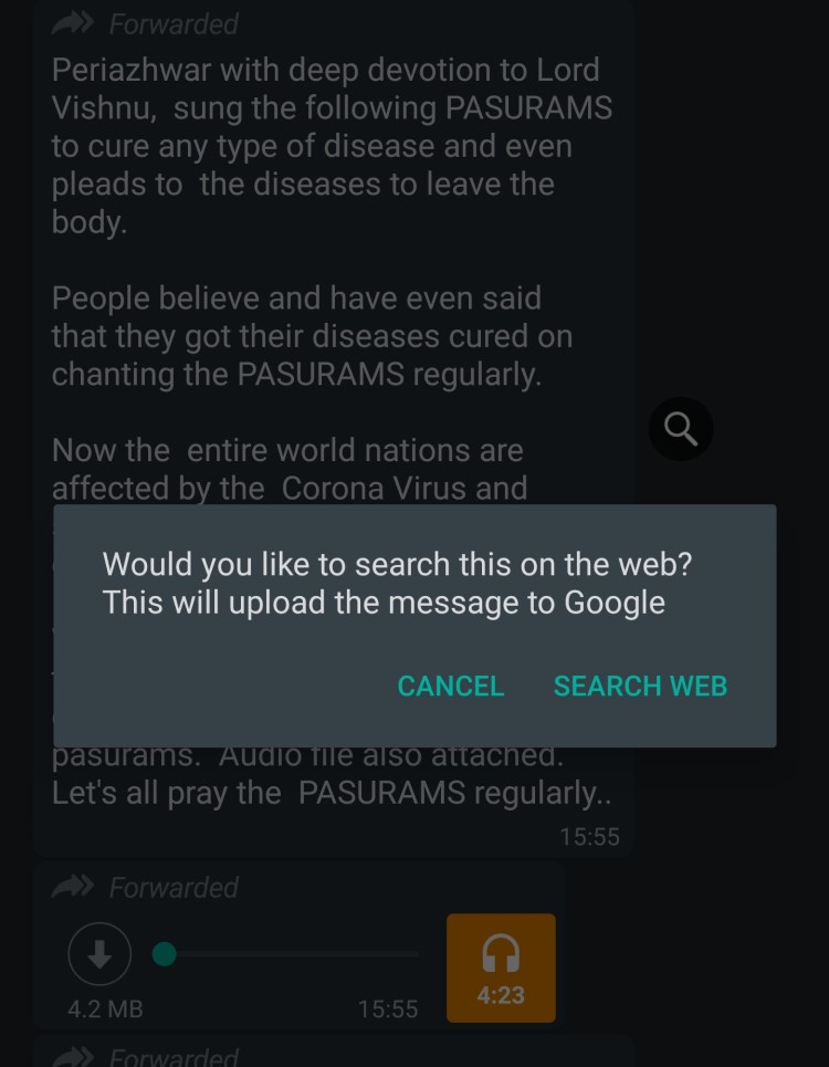 O WhatsApp parece ter adicionado um ícone de pesquisa ao lado de Mensagens encaminhadas para pesquisar diretamente com o conteúdo do encaminhamento no Google – mensagens que foram chamadas de falsas, geralmente aparecem no topo.